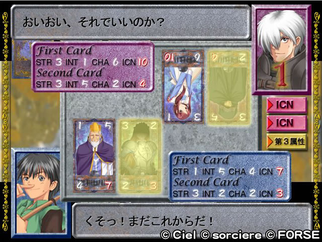 全22枚のタロットカードをつかったカードバトル.各カードには,STR(体力)・INT(知力)・CHM(魅力)・ICN(イコン)の4属性が存在.