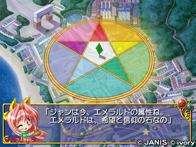 この5つの主属性には,実は優劣が存在します.例えば,ルビーの属性はエメラルドの属性には強く,アクアマリンの属性には弱い……といった具合です.そしてここからが重要なのですが,苦手属性に属するヒロインは,主人公の前に姿を見せなくなってしまいます.魔法というものが非常にデリケートである証明なのですが,つまり,主人公の属性を苦手とするヒロインが常に1人存在するわけで,その彼女とのイベントを発生させていくためには自分の属性を,彼女の苦手でないものに変化させなくてはならないのです(例外的に,初期値のままのニュートラルな属性であった場合は5人全員とイベントを発生させることができますが,会話イベントを重ねつつ属性をニュートラルに保つのは極めて難しいといえます).